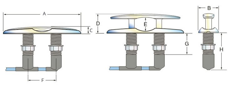 A retractable stainless steel cleat with a thin profile that installs easily. Spring loaded stay up design. Each stanchion is a 7/8" stainless steel rod. Drainage receptacles (included) capture moisture and send it to the bilge via pitot tubing (not included). Installation is simple even on narrow gunwales - just drill twice with an appropriate size hole saw.