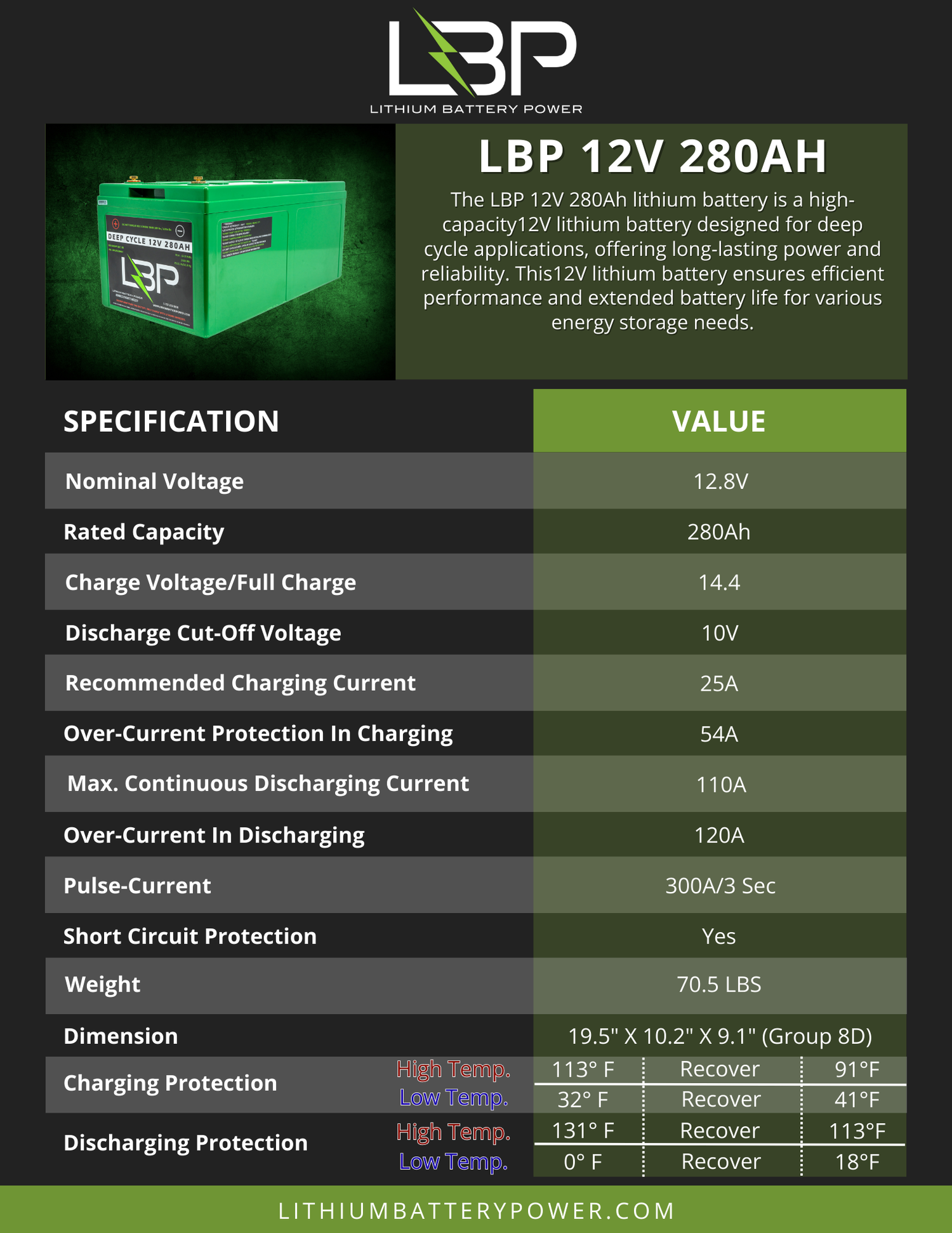 The LBP 12V 280Ah Lithium Battery is a high-capacity 12V deep-cycle power source designed for serious energy storage needs. It delivers long-lasting, reliable power for applications that demand extended runtime, stable voltage and efficient performance. Whether you are building a house bank for your boat, upgrading an RV system or expanding an off-grid solar setup, this battery provides robust 12V storage in a single, compact unit.
