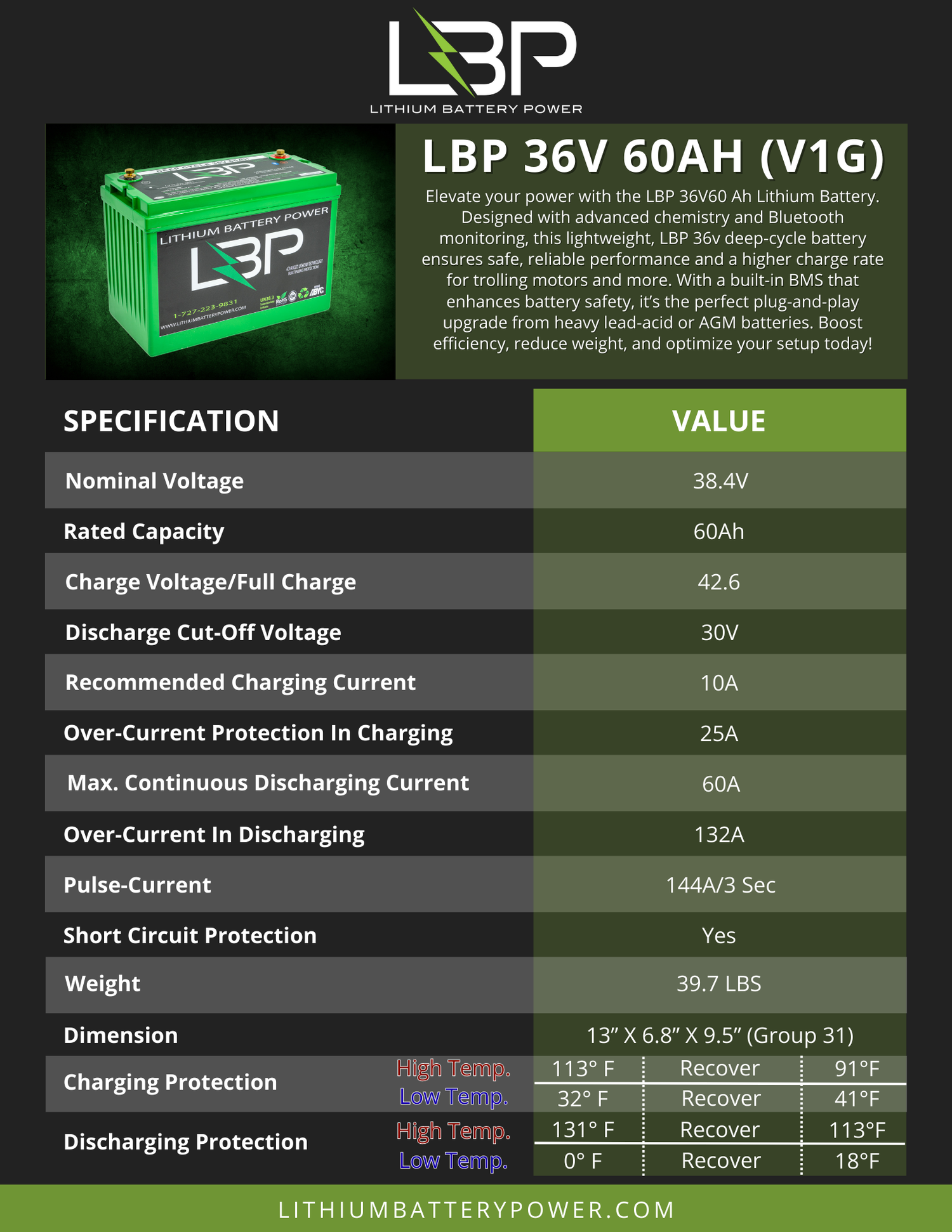 Elevate your power system with the LBP 36V 60Ah Lithium Battery with Bluetooth monitoring. This lightweight, deep-cycle battery is built for safe, reliable performance and higher charge rates, making it an ideal upgrade for trolling motors and other demanding 36V applications. With advanced lithium chemistry and smart monitoring, it helps you boost efficiency, reduce weight and optimize your entire setup.