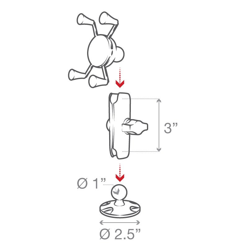 The RAP-B-138-UN7U consists of a 2.5" diameter round base featuring the universal AMPS hole pattern, medium length composite double socket arm, and the popular spring-loaded RAM X-Grip phone holder. The RAM X-Grip features an 'X' design that expands and contracts to provide a perfect fit for your device - even if it's in a case.