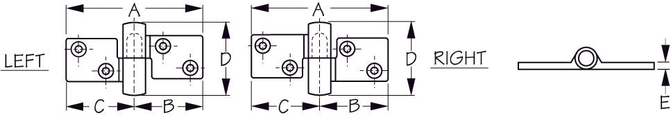 Corrosion resistant cast 316 stainless Take-Apart Hinges allow a door or lid to be removed after installation without having to remove the fasteners. Surface mounted. Can be used horizontally or vertically. Installs with four #10 FH fasteners (not included).