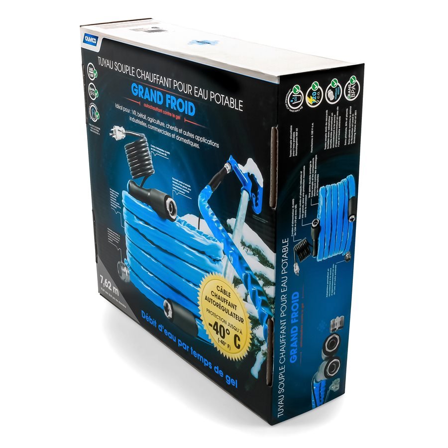 The core of the Camco 25-Foot Heated Drinking Water Hose is made with an NSF 61 certified, drinking water safe hose that is BPA, phthalate and lead-free. The Heated Drinking Water Hose won’t leach harmful chemicals into your water or leave it tasting like plastic the way standard garden hoses do. It is ideal for RVs, livestock, agriculture, kennels and other industrial, commercial and residential uses. A self-regulating heating cable is ideal for water line freeze protection down to -40° F/C. The internal diameter of the hose is 5/8-inch, and the fittings are heavy-duty machined and plated for maximum corrosion resistance. The durable exterior jacket protects the water hose and electrical components from damage or exposure. Operates on 120VAC and uses an 18AWG 10-foot power cord with LED indicator plug. CSA Low Lead Content Certified to NSF/ANSI 372. Compliant with all federal and state level Low Lead Laws.