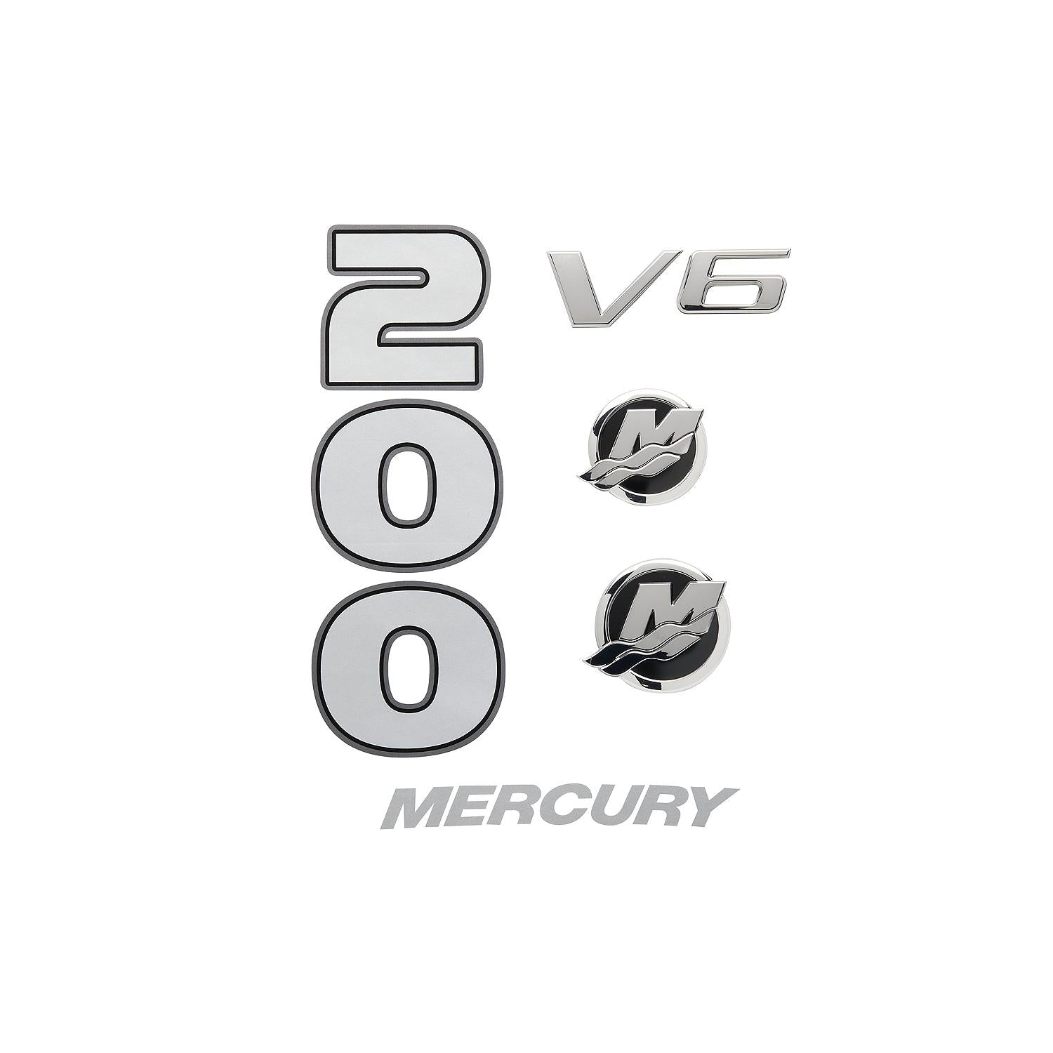 - Includes rear two hundred horsepower decal, rear Mercury wordmark, V6 badge and two M-icons