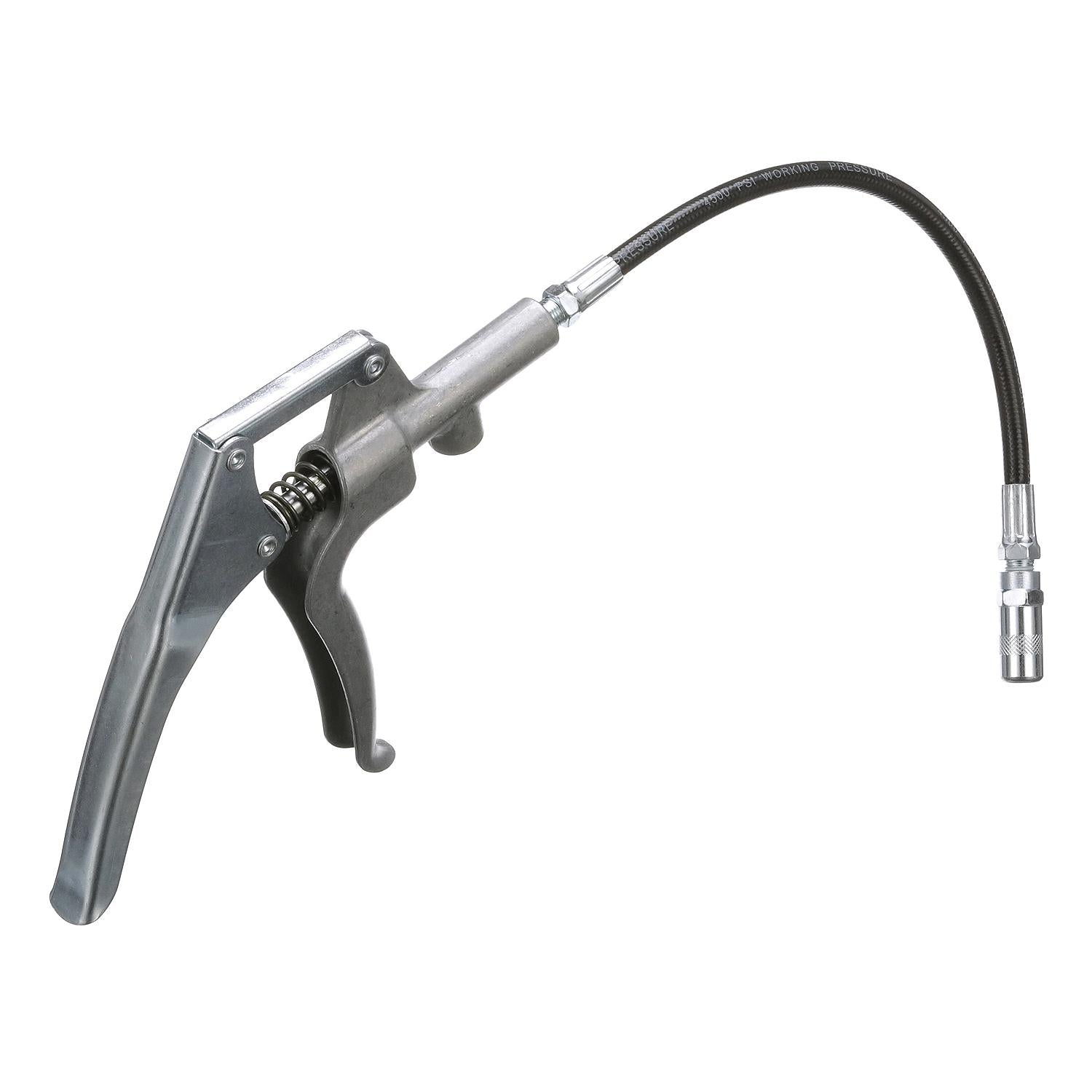 Includes the pistol grip gun, twist-on tube attachment, and flexible hose with zerk fitting.