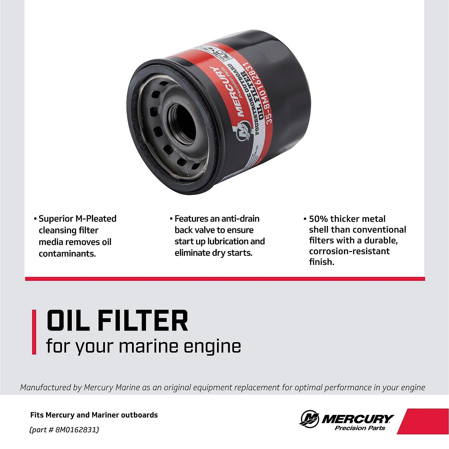 Mercury Outboard Oil Filter 10 15 20 Carbureted 4-Stroke 25 30 EFI 4-Stroke 25 Jet EFI - 35-8M0162831 Supersedes 35-822626K03